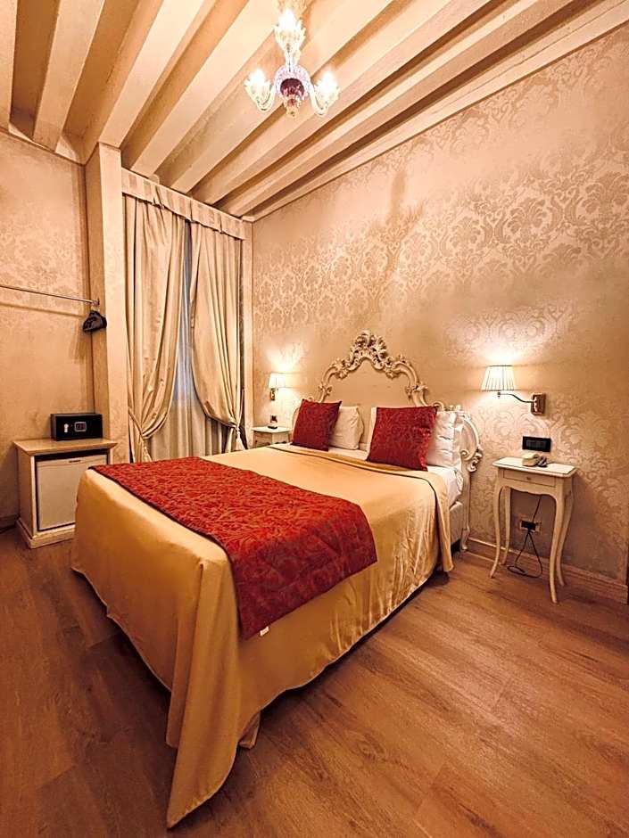 Room with attached bathroom with air conditioning, a TV with satellite channels, and a fridge. It has characteristic Venetian-style decors.